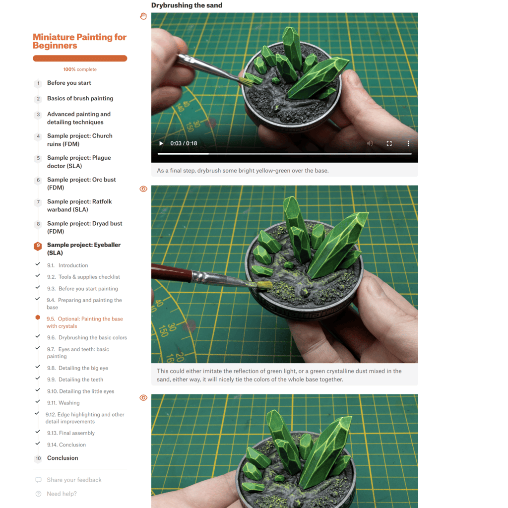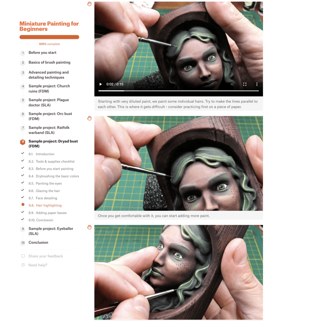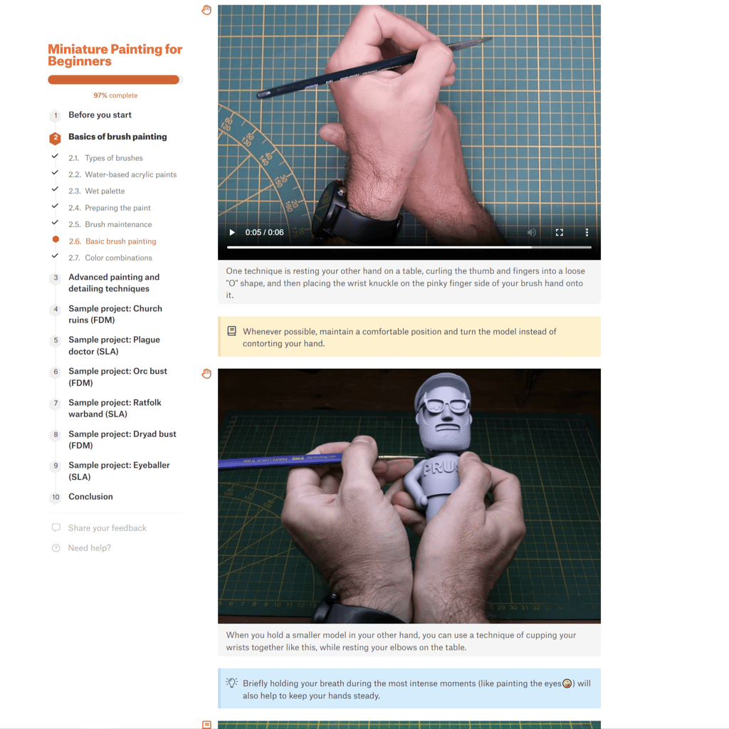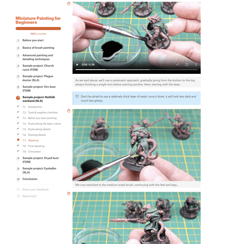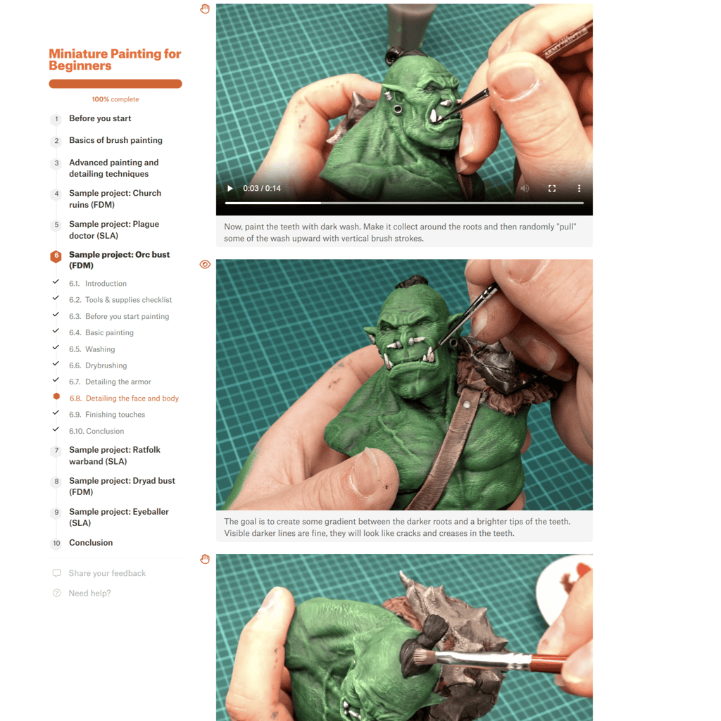 In the second half of the course, you’ll find six sample projects where we demonstrate the techniques and tools described in the theory lessons on specific models. We prepared a mix of different print technologies (both SLA and FDM), sizes, visual styles, and levels of difficulty. In a detailed “step-by-step” format, we always describe the complete painting process from a fresh print to a finished model: