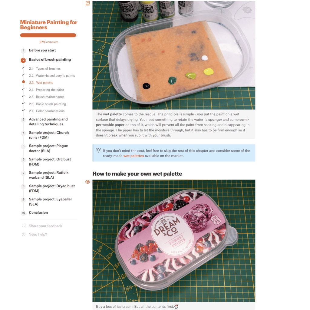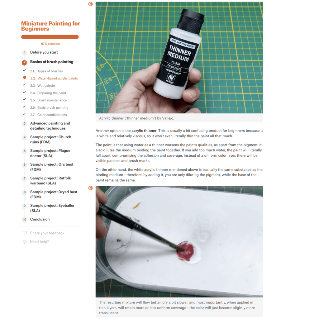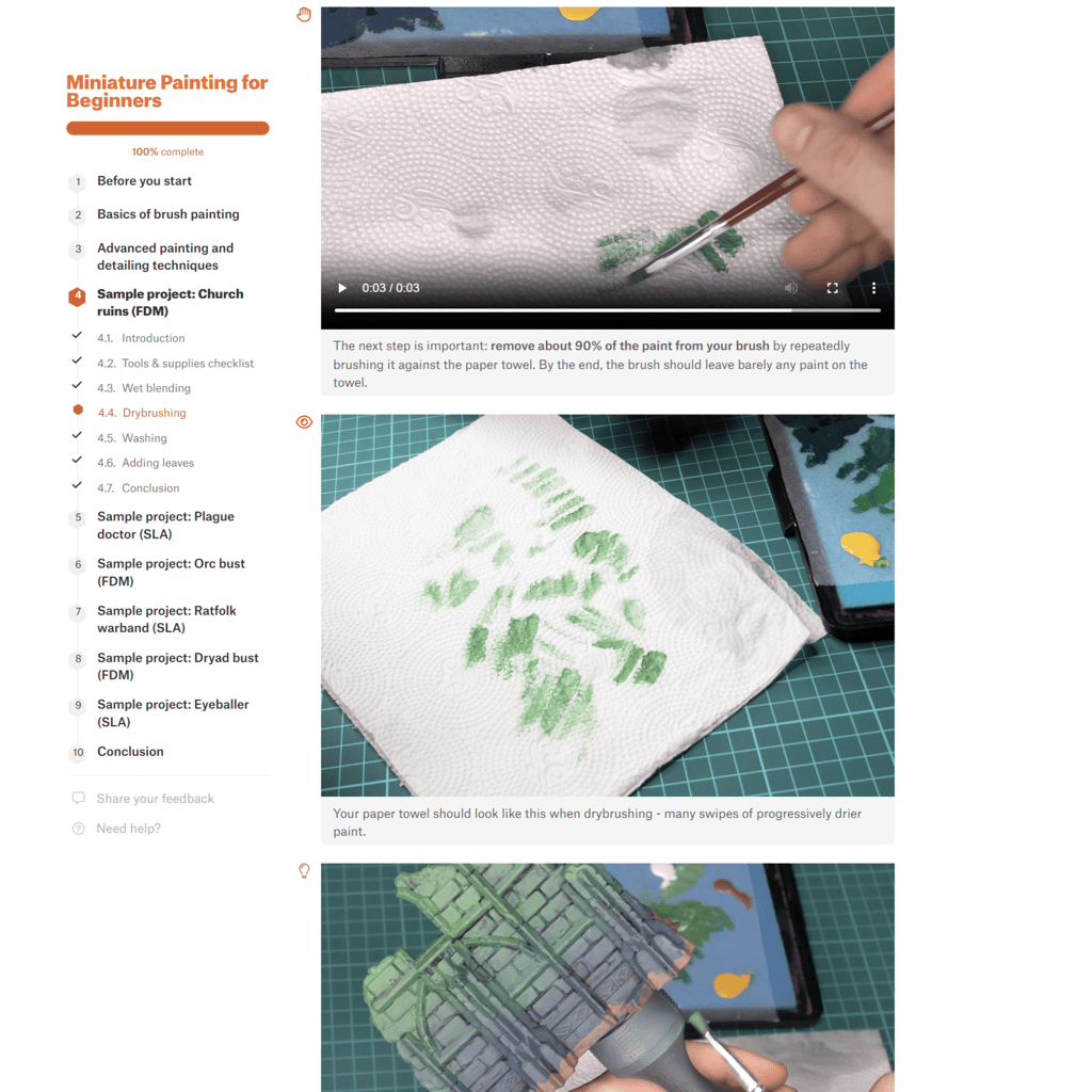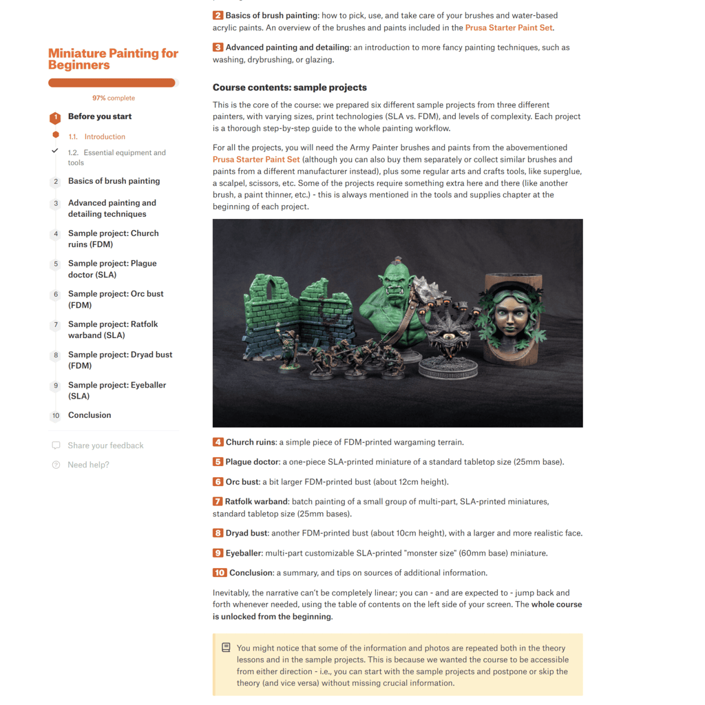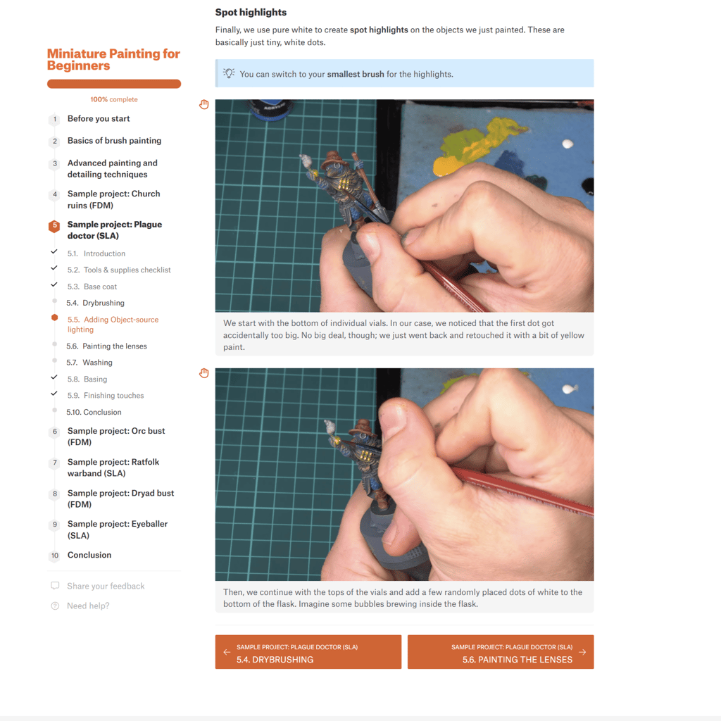 In the second half of the course, you’ll find six sample projects where we demonstrate the techniques and tools described in the theory lessons on specific models. We prepared a mix of different print technologies (both SLA and FDM), sizes, visual styles, and levels of difficulty. In a detailed “step-by-step” format, we always describe the complete painting process from a fresh print to a finished model:
