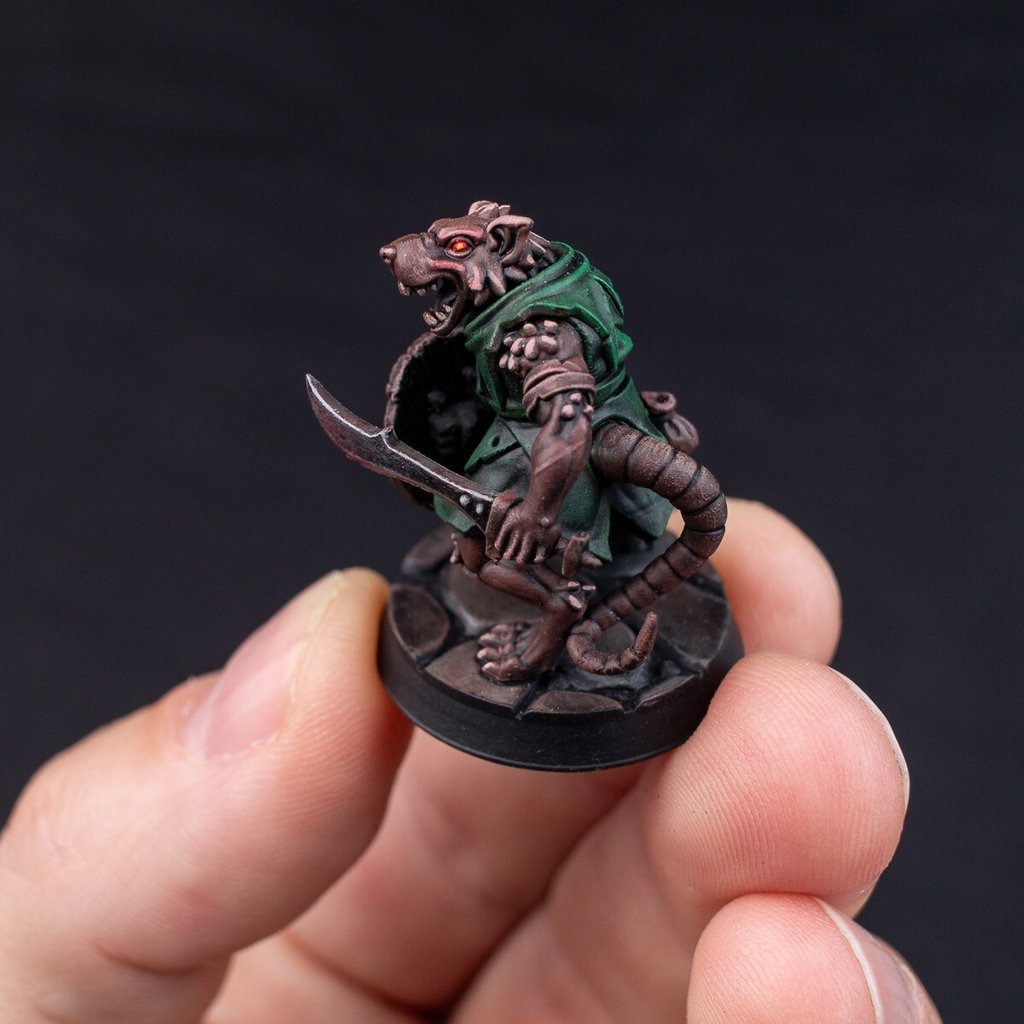 - Ratfolk warband: batch painting of a small group of multi-part, SLA-printed miniatures, standard tabletop size (25mm bases).